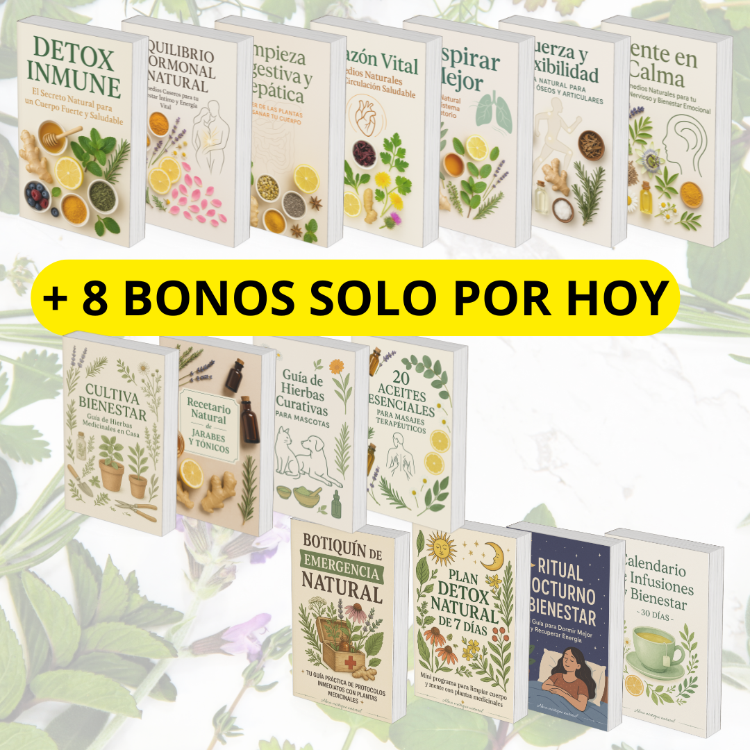Cada bono fue creado para ampliar tu experiencia de bienestar. No son “extras decorativos”: te dan herramientas prácticas para aplicar lo aprendido, cuidar también a quienes te rodean (incluidas tus mascotas) y llevar la salud natural a tu día a día. Muchos usuarios nos dicen que los bonos solos valen tanto como el producto principal.